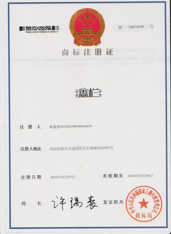 恭喜!新鄉鑫欄護欄廠商標證書成功注冊下來!